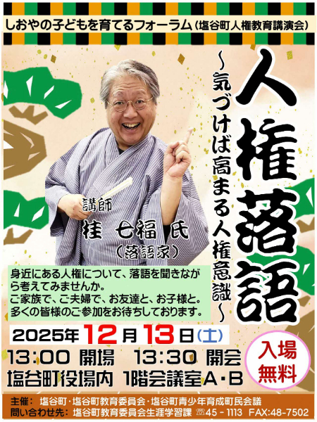 今年度は、「人権落語」を開催します。落語を聞きながら、言葉の大切さについてお話しいただきます。親子で、家族で、お友達と、人権と言葉について考えてみましょう。