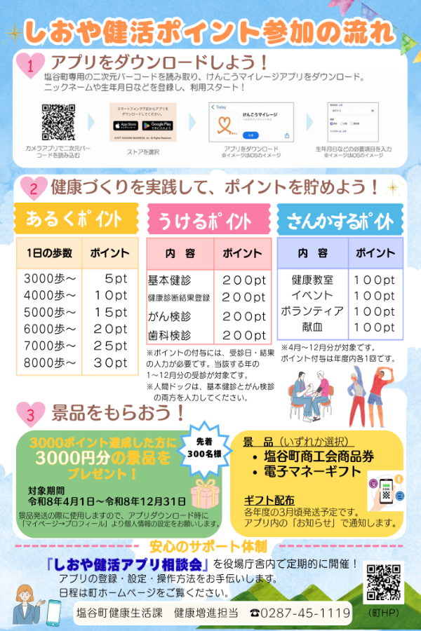 スマートフォンアプリを活用して計測した歩数、健診受診、健康教室等への参加に対してポイントを付与し、景品と交換できる、健康づくりに取り組む方を応援する仕組みです。