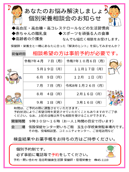 栄養相談会では、生活習慣病から、離乳食・介護食、スポーツを頑張る人の食事まで、幅広く相談をお受けします。