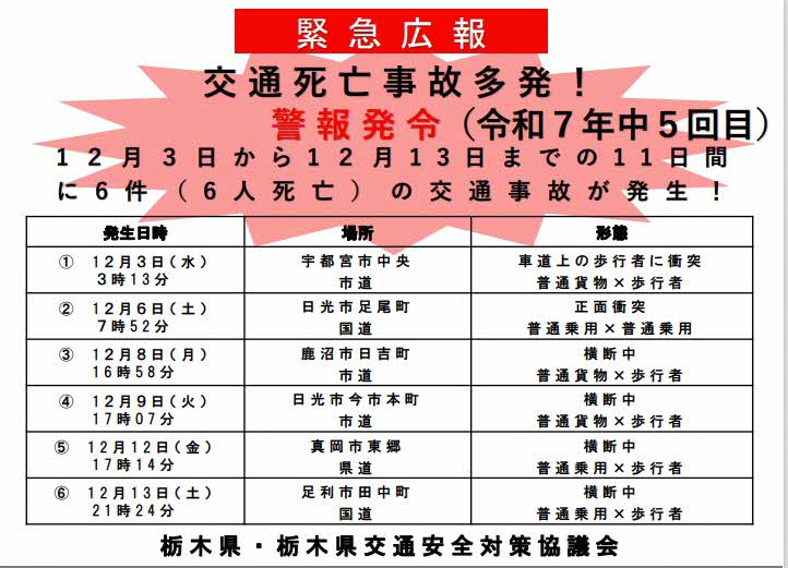 栃木県内で7日間に4件以上の交通死亡事故が発生し、栃木県では交通死亡事故多発警報を発令しています。