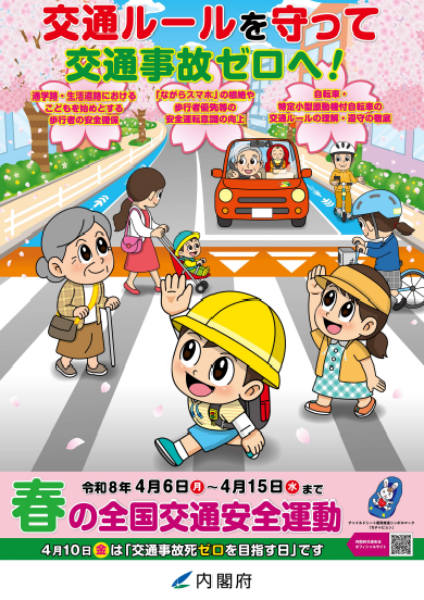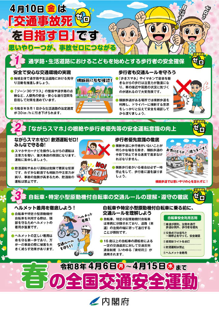 また、運動期間中の4月10日(金)は「交通事故死ゼロを目指す日」です。大切な命を交通事故で失うことがないよう、より一層交通安全に注意していきましょう。