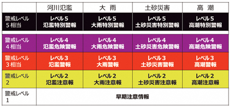 この新たな防災気象情報では、河川氾濫・大雨・土砂災害・高潮の警報などを、避難行動に対応した5段階の警戒レベルと整合させ、災害発生の危険度に応じたレベルの数字を名称に含めて発表します。レベル5に相当する河川氾濫の特別警報や警戒レベル4に相当する危険警報も新たに開始するなど、現行の大雨警報・注意報などが大きく変わります。